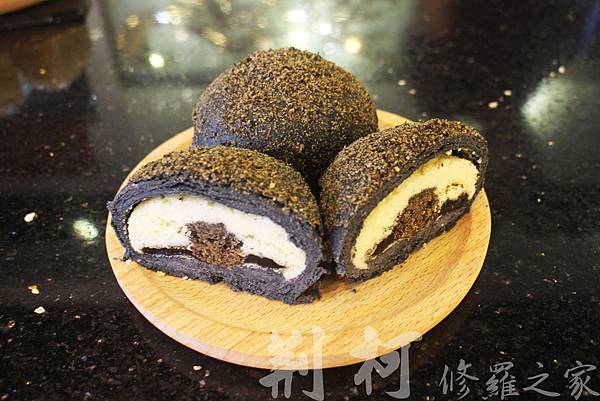 竹炭黃金餅,黑芝麻、黑糖麻糬、黃金豆沙,外皮為竹炭酥皮。